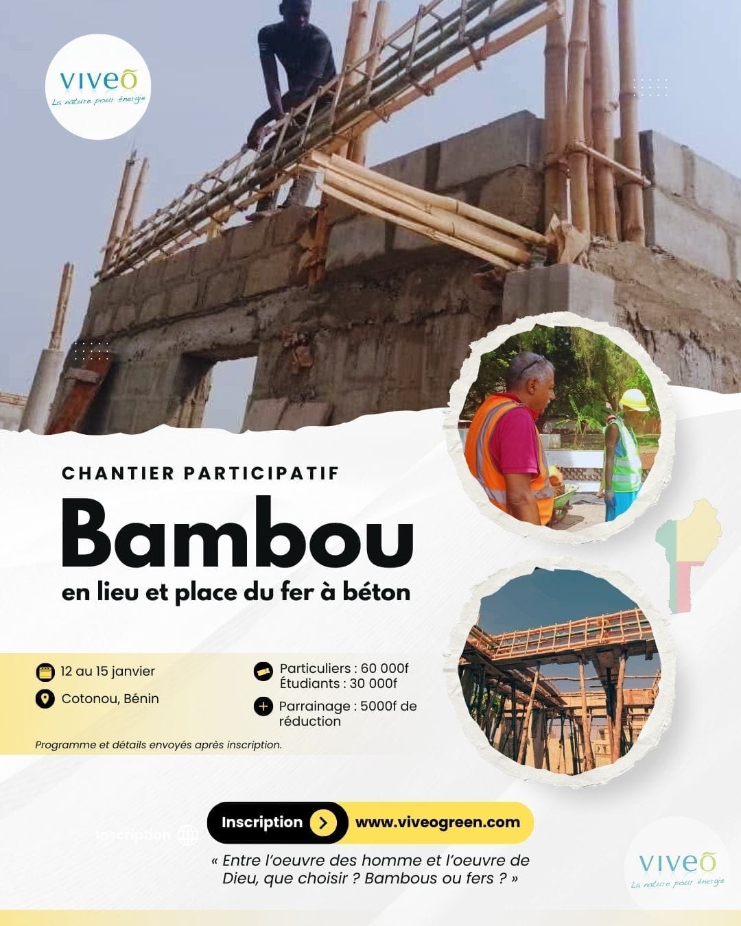 Pré-inscription pour le chantier participatif bambou en lieu et place du fer à béton à Cotonou (Bénin).